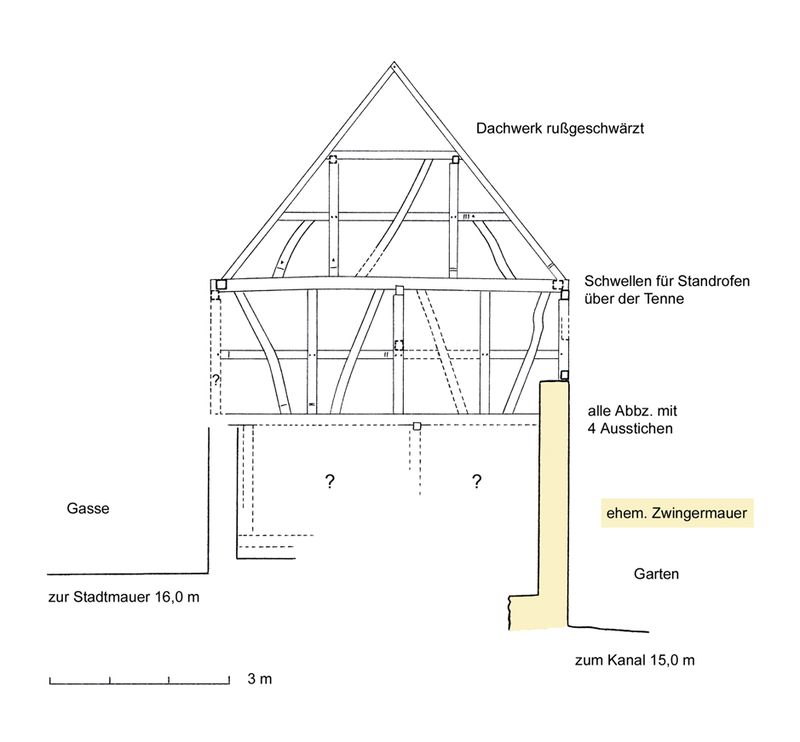 EG massive Außenwände, darauf Stockwerk mit Fachwerkwänden, Dachwerk mit stehendem Stuhl