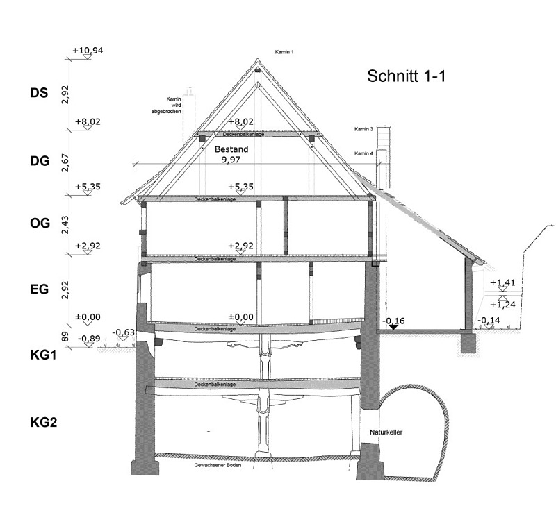 1402 (d) wurde das Haus als zweistöckiger Fachwerkbau über dem älteren Keller errichtet (Bauphase II). Der zweigeschossige Steinkeller ragt nun weit über das Außenniveau hinaus, so dass er ein hohes Sockelgeschoss bildet. Die Außenwände des Aufgehenden besaßen durchlaufende Ständer, mit dem Traufrähm und Dachbalken durch Kopfbänder und Streben verbunden. Das Dach wird durch einen doppelten, stehenden Stuhl ausgesteift. Scherbänder ziehen von den Seitenwänden bis zu den Firstständern hinauf (Queraussteifung). Im Westen und Osten war ein Spitzgiebel vorhanden, dessen Aufbau die Konstruktion des Dachwerks spiegelt. Die Hölzer sind verblattet.