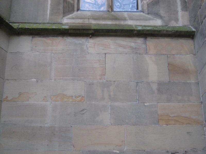 An den Außenwänden des Chores und des Langhauses befinden sich zahlreiche Steinmetzzeichen.