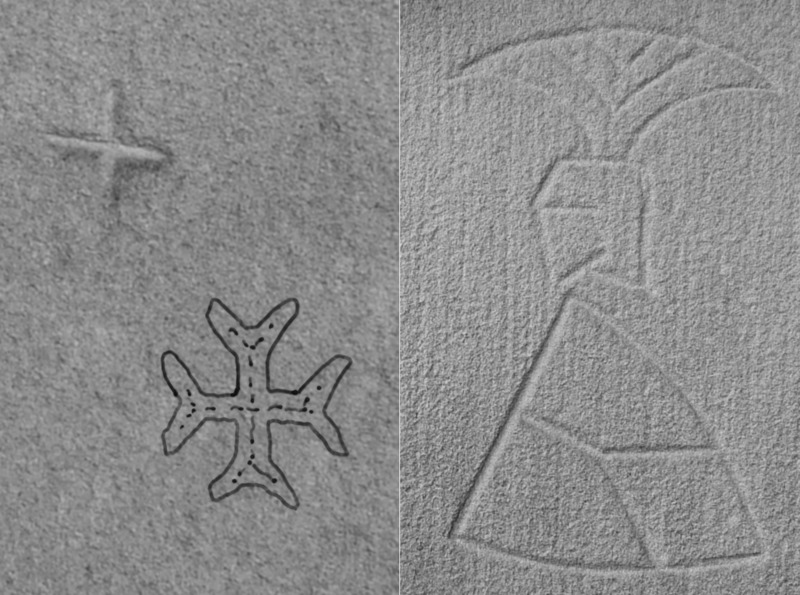An der nördlichen Außenwand des Chores sind Fragmente einer Wandmalerei auf dem Stein erkennbar - mehrere Figurengruppen zeigen Nimben.