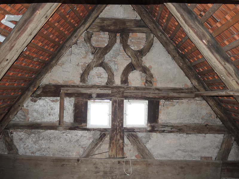 Im 1. Dachgeschoss ist die Dachwerkskonstruktion teilweise einsehbar. Hier wurde eine zweifach liegende Stuhlkonstruktion aus Nadelholz errichtet, die mit verblatteten Verbindungen gefügt wurde. Die Hölzer zeigen eine Rußschwärzung, was für ein ehemals "kaminloses" Rauchdach spricht.