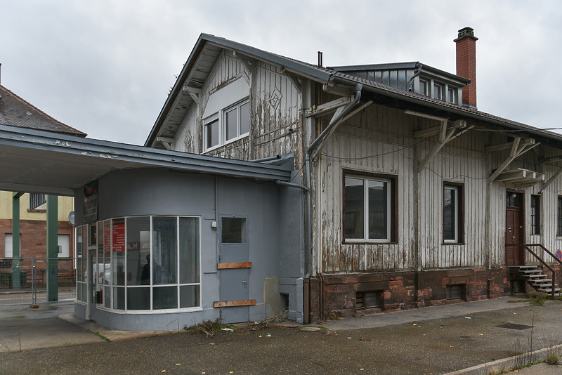 Holzbau mit Holzfassadenverkleidung auf einem Natur-Werksteinsockel (roter Buntsandstein); fünf Konstruktionsachsen, die an der Fassadenaufteilung ablesbar sind. Auskragendes Satteldach, dessen Überstand durch angewinkelten Bughölzer erreicht wird, welche mit Zugbändern in Form von Holzzangen horizontal an die Ständer zurückbinden. Die Traufpfette wird zudem von Kopfbändern, welche an die Büge anschließen, unterstützt.