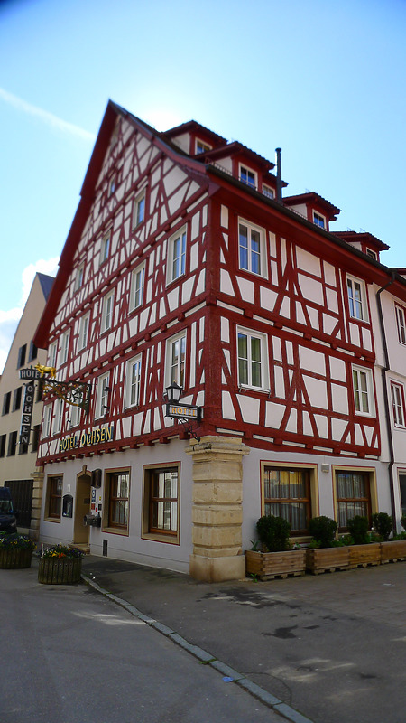 Im Kernbestand handelt es sich bei dem heutigen Hotel zum Ochsen um ein nachmittelalterliches Gebäude. Im Jahr 1457 wird das frühere Gasthaus erstmal im Besitz des Richters Hans Ross genannt. 1730 wurde das Gebäude nach Zerstörungen durch einen vorangehenden Brand, der zahlreiche Gebäude der Marktstraße befiel, wieder aufgebaut. 1934 wird die "Gastherberge Ochsen" hin zum "Hotel Ochsen" modernisiert. 1997 werden die Fachwerkobergeschosse freigelegt. (a)