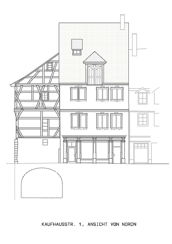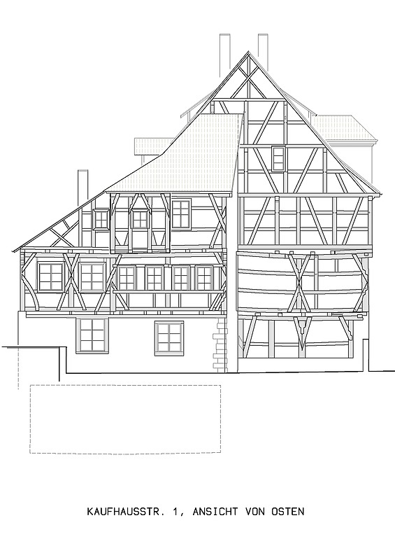 In der Ostwand des Westteiles ist das Fachwerk noch weitgehend vorhanden, partiell im Zustand einer vorangegangenen Sanierung. In Anlehnung an den angetroffenen Altbestand erlaubt dieser gesicherte Aussagen zur Gliederung des Erdstocks. Danach handelt es sich um ein eichenes Traggerüst mit verblatteten Winkelhölzern für dessen Aussteifung. Das Traggerüst ist im Gründungsbereich weitgehend unterfangen. Eingedeckt mit einer in Ost-West-Richtung verlegten Querbalkenlage wird die Spannweite der Balkenlage durch einen Längsunterzug nahezu halbiert. Getragen wurde der Unterzug durch zwei Säulen, von denen die Lage der südlichen Säule im Keller schon erkennbar ist und die im Erdgeschoss hinter einer auffallenden Holzverkleidung zu vermuten ist. Die Lage der zweiten Säule ist wohl an der Stelle der heutigen Gusssäule anzunehmen. Das beschriebene Traggerüst gliederte eine offene, ohne Untereilung ausgeführte Halle. Deren ursprüngliches Niveau lag ca. 90 cm unter dem heutigen Gehhorizont, wobei für das 15. Jahrhundert ein nach Süden abfallendes Geländeniveau angenommen wird. Die heutigen Einbauten stammen aus dem 19. Jahrhundert und stehen mehrheitlich im Zusammenhang mit dem Einbau eines Ladengeschäftes und dem davon abgetrennten Gang mit Treppenhaus.