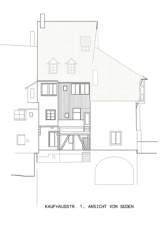 In Anlehnung an die geschlossene Fachwerkgestaltung der freiliegenden Ostfassade und ergänzt durch die Lage der oberen Treppenläufe wird der alte, in den Oberstock führende Treppenaufgang entlang der Ostwand vermutet. Der Austritt im 1. Obergeschoss ist noch vor dem Zugang in den Ostteil anzunehmen.