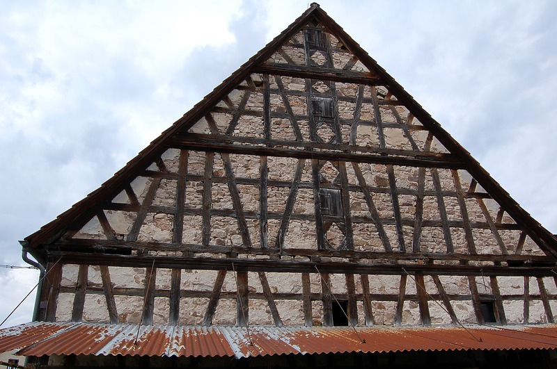 Der eigentümliche Bogen im Fachwerk hält eine Unikatsstellung im Scheunenbau unserer Region. Die Hölzer sind mit den Ständern, Riegeln und Streben verblattet und mit Nägeln in diesen Verblattungen gesichert. Die ursprüngliche Absicht des Zimmermanns war wohl, das aufgeschlagene Fachwerk in sich stabil und gegen Durchbiegung so lange gesichert zu halten, bis die darunter aufzurichtende Mauer kraftschlüssig unter der Schwelle stand. Ein andere Erklärung dieses Phänomens scheidet aus.