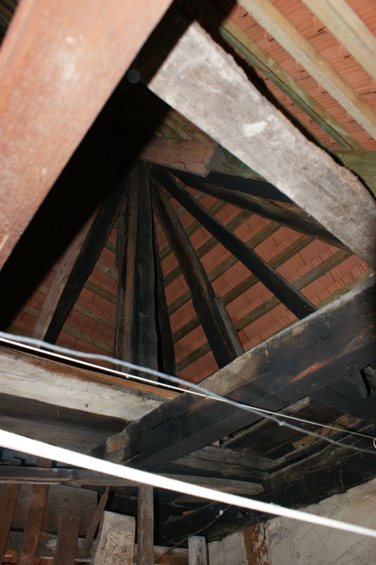 Die darüber liegende Ebene ist frei zugänglich und erlaubte eine weitgehend vollständige Aufnahme der alten, in Anlehnung an die starken Senkungen wohl ursprünglich binderlosen Dachkonstruktion.