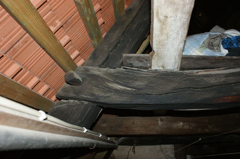 Die eigentliche Untersuchung beschränkte sich auf das Dachwerk, dessen erste Ebene ausgebaut ist und insofern keine historische Befundaufnahme zuließ. Lediglich im Bereich des Treppenlaufes nach oben konnte ein die Kehlbalken unterstützendes Längsholz erkannt werden. Entsprechend seiner Einbindung in den rückwärtigen Giebel und seiner Patina handelt es sich um einen späteren Einbau.