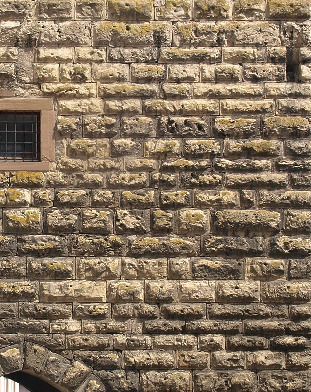 In Lager- und Stoßfugen des Quaderverbands des Oberbaus – einschließlich der ersten Steinlage oberhalb der Buckelquader – und des Treppenturms stecken Stopfstücke aus verschiedensten Materialien, die auf die Errichtung zurückgehen, mit denen auch Hohlräumen des Tuffsteins gefüllt wurden: Dolomit, Stuben-, Bunt- und seltener Schilfsandstein, Tonschiefer, Flach- und Hohlziegel. Vor allem aus der Nähe betrachtet ergeben deren Farben ein buntes Bild. Das war so sicherlich nicht gewollt und kann nur damit erklärt werden, dass die Mauerflächen einen deckenden Verputz erhalten haben. Davon finden sich im 1. Oberbaugeschoss auf der Südseite noch große Partien, deren abgewitterte Oberfläche den Tuffsteinen sehr ähnlich sieht.