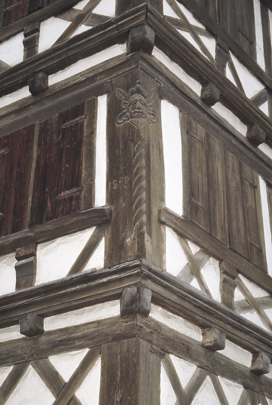 Das Innere der beiden Obergeschosse nur in der Fachwerkkonstruktion ausgebaut, ohne Wandfüllungen, ohne Fenster, weitgehend ohne Dielenböden und komplett ohne sonstige Ausstattung.