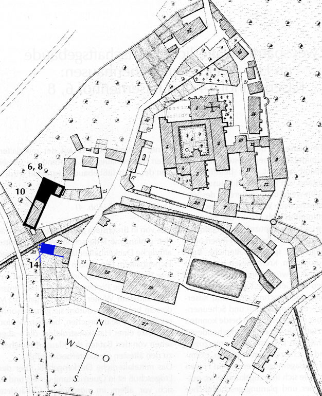 Wie die bauhistorische Untersuchung ergeben hat, enthält das Gebäude Kasernenhof 14 im Klosterhof zwei wichtige mittelalterliche Bauphasen: eine erste, dendrochronologisch auf 1314/15 datierte Phase, der das Deckengebälk über dem Erdgeschoss samt Mittelunterzug, Mauerlatten und Teilen der Erdgeschossausenwände angehört, und eine zweite Phase, die dendrochronologisch auf 1422/23 datiert werden konnte, und der das Kerngerüst des Obergeschosses sowie das gut erhaltene Dachwerk angehören. Während der Bau der ersten Phase somit nur noch sehr fragmentarisch auf unsere Zeit gekommen ist und Aussagen zu seiner Nutzung sowie zum Aussehen der höhergehenden Bauteile nicht möglich sind, ist der Oberbau des 15. Jahrhunderts in seiner Konstruktion zumindest soweit erhalten, daß sich eine Wohnnutzung für das Obergeschoss unschwer erkennen lässt. Die hierzu gehörende Bohlenstube in der Nordostecke hat sich noch in umfangreichen Resten erhalten, während im Restbereich zur einstigen Innengliederung kaum eindeutige Aussagen möglich sind. Zur seinerzeitigen Nutzung des zu jenem Zeitpunkt allenfalls spärlich unterteilten Ergeschosses liegen aufgrund des Fehlens nutzungsspezifischer Ausstattungsreste keine Anhaltspunkte vor. Spätestens für das 17. Jahrhundert kann dann hier eine Werkstattnutzung angenommen werden, die sich mit der Benennung des Gebäudes als Klosterschmiede in Einklang bringen lässt, aber gut auch anderen Handwerkszwecken gedient haben könnte. Die Ausrichtung der Bohlenstube des Obergeschosses gegen Nordosten wie auch die ursprüngliche Krüppelwalmausbildung an der Ostseite weisen darauf hin, dass die östliche Anschlussbebauung im frühen 15. Jahrhundert noch nicht bis an das Gebäude heranreichte. Erst später wurde die Ostseite vollständig verbaut, und auch die mächtige südliche Außenmauer, auf der der Fachwerkoberbau aufsitzt, gehört in der heutigen Form ebenso zu den nachträglichen Veränderungen wie die Innenwände des Erdgeschosses und des ersten Dachgeschosses sowie ein Großteil der Innenwände des Obergeschosses.
