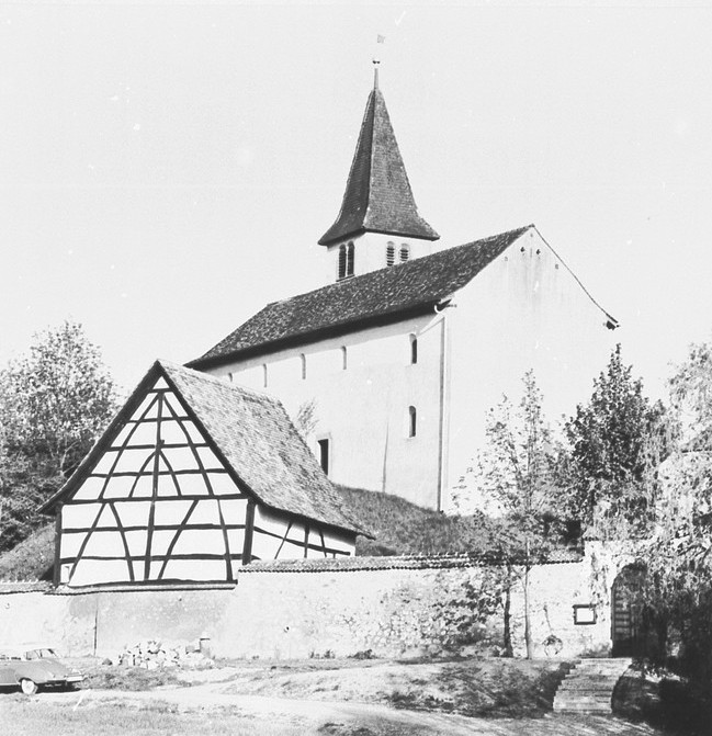 NW-Ansicht Bergkirche mit Scheune (1973) / Sog. Leichenhaus (Scheune) in 78266 Büsingen, Büsingen am Hochrhein (Bildindex Foto Marburg: J. Lebrun; Aufnahme-Nr. B 623/1; Microfiche-Scan mi00347f08.)