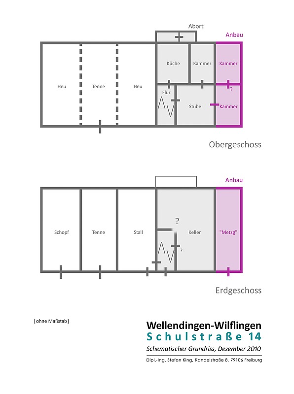 Da es sich beim giebelseitigen Abschnitt um einen Anbau handelte, ist die Wohnstube hinter den beiden südlichen Fenstern mit Fensterläden zu suchen und der Flur hinter dem dritten über der Haustür, was mit den Angaben von M. Bolsinger übereinstimmt. Die Lage der Küche gibt sich an der Stellung des Kamins zu erkennen, wonach sie in Verlängerung des Flurs zu suchen war. Daraus kann ein Grundriss abgeleitet werden, wie er für kleinere Bauernhäuser typisch ist, wo an der Vordertraufe eine breite Stube und ein schmaler, kurzer Flur sich mit einer schmalen Kammer und einer breiten Küche an der Rücktraufe so überschnitten, dass ein gemeinsamer Wandabschnitt Stube und Küche verband, um hier die Ofenanlage unterzubringen. Der Hausflur führte direkt auf die Küche zu und die giebelseitige Kammer war von der Stube aus zugänglich. Mit dem späteren Anbau wurde dieser Wohngrundriss dann um zwei weitere gefangene Kammern erweitert.