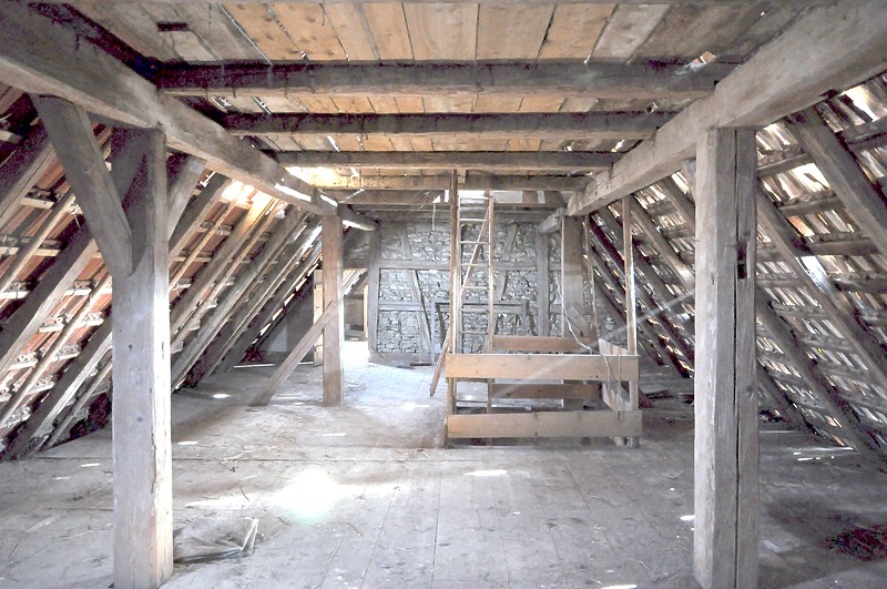 Auch die ursprüngliche Trennung der Dachbereiche wurde verändert: Der Südteil der Trennwand wurde entfernt. Auf eine Zweitverwendung von Türpfosten, Sturz und Schwelle weist die Veränderung der Aufschlagrichtung der Tür inklusive Eintiefung für die Wendebohle an verschiedenen Stellen hin. Die Treppe vom 1. Ins 2. DG befand sich anfangs an der östlichen Giebelwand, wie der schräg nach oben verlaufende Abdruck der ehemaligen Treppenwange verrät. Ausnehmungen in den Kehlbalken markieren die Lage des Kamins. Letztlich hat der Kamin mit der Treppe später den Platz getauscht.