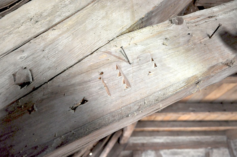 Ebenfalls mit massivem Mauerwerk gefüllt ist die neue Fachwerkwand zwischen Tenne und Garage. Im Zuge deren Einbaus wurden die unteren Bereiche des westlichen Bundständerpaars entfernt. Die Reste der Bundständer stehen auf der Fachwerkwand. Hier finden sich Abbundzeichen aus Bleistiftstrichen.
