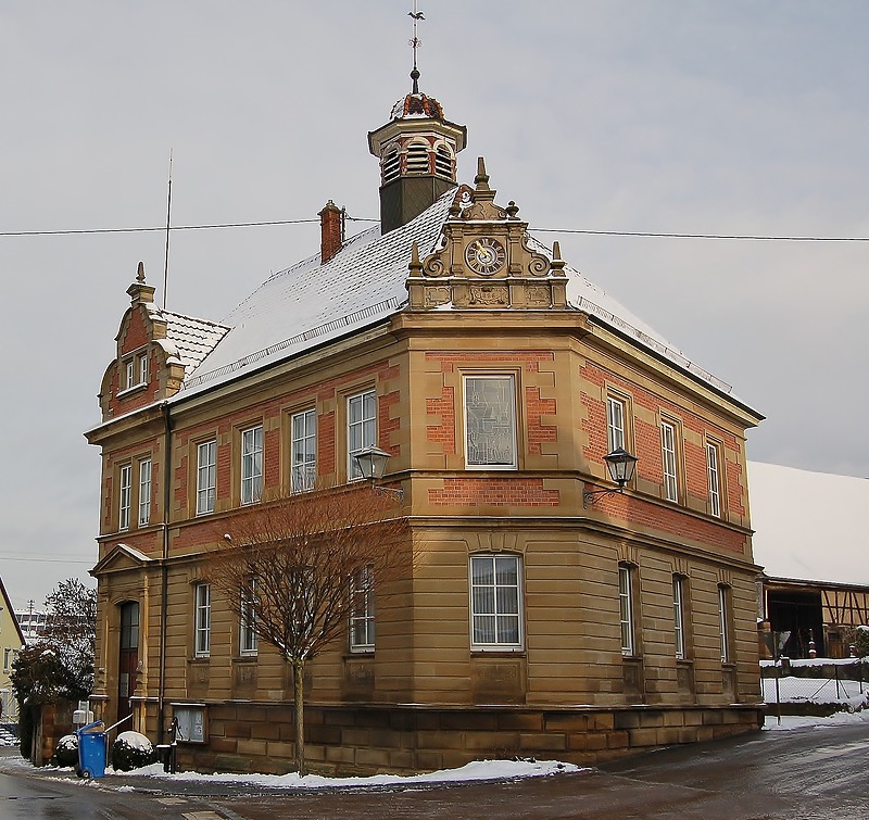 In städtebaulich dominanter Stellung an der Ortsdurchfahrt/ Ecke Rathausstraße prägt der Neorenaissancebau mit seinen Schaugiebeln und dem achteckigen Dachreiter das Gesicht des Ortbereiches.