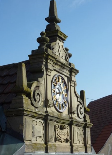 Die verspielten Ziergiebel über der „Brusttuch-Ecke“ und über dem Hauseingang an der Hauptstraße