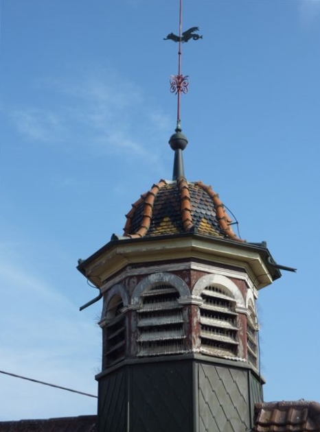 Der mit Holz, Blech und Faserzementplatten verschalte, achteckige Glockenreiter auf dem Dachfirst trägt über seinen allseitigen Schallläden auf breitem Gesims eine „Welsche Haube“ mit einer kunstvoll geschmiedeten Wetterfahne.