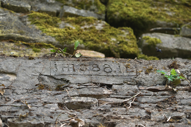 In Zementmörtel geritzte Inschrift an der oberen Kante des Strebepfeilers: iH 1888 iL / Stadtmauer in 79206 Breisach, Breisach am Rhein (12.2021 - S. King)