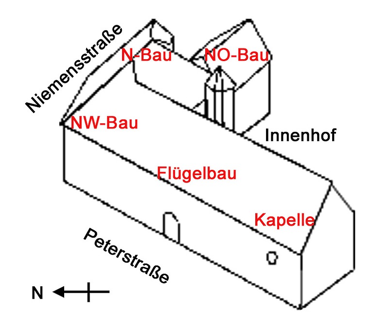 - dem Nord-, Nordwest- und Nordost-Bau an der Niemensstraße mit hofseitigem Wendeltreppenturm