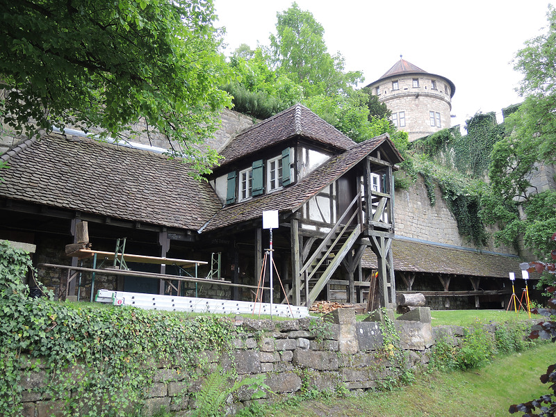 Die Kegelbahn lehnt sich mit ihrem Pultdach an die Schlossmauer, in welche steinerne Konsolen eingemauert wurden, die wiederum Ständer für das obere Stuhlrähm tragen. Die Ständer und Kopfstreben sind mit Abbundzeichen in Form von römischen Ziffern und Dreieckskerben versehen, die eine durchgängige Zählung besitzen. Somit kann das hölzerne Tragwerk des Gartenhauses und der Kegelbahn als einheitlich und zeitgleich angesehen werden. Vereinzelt finden sich Wiedlöcher an den Balken. Diese belegen, dass das Bauholz des Gebäudes geflößt wurde und somit sehr wahrscheinlich aus dem Schwarzwald stammt und über den Neckar hierher transportiert wurde.