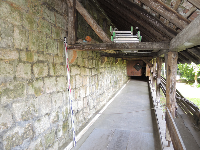 Blick nach Westen über die Kegelbahn mit ihrem gegen die Schlossmauer angelehnten Pultdach / Historische Kegelbahn in 72070 Tübingen (22.05.2014 - Markus Numberger)