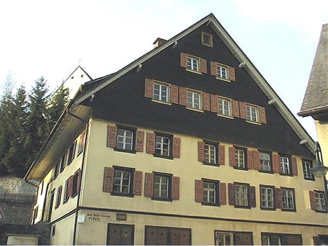 Im massiven Erdgeschoss an der freistehenden Giebelseite hat man sich die frühere Schmiede zu denken. Die wohl aus Bohlenständerwerk gefertigten, heute aber verputzten Obergeschosse dienten abgesehen von einem früheren Ökonomieteil an der Bergseite zu Wohnzwecken.