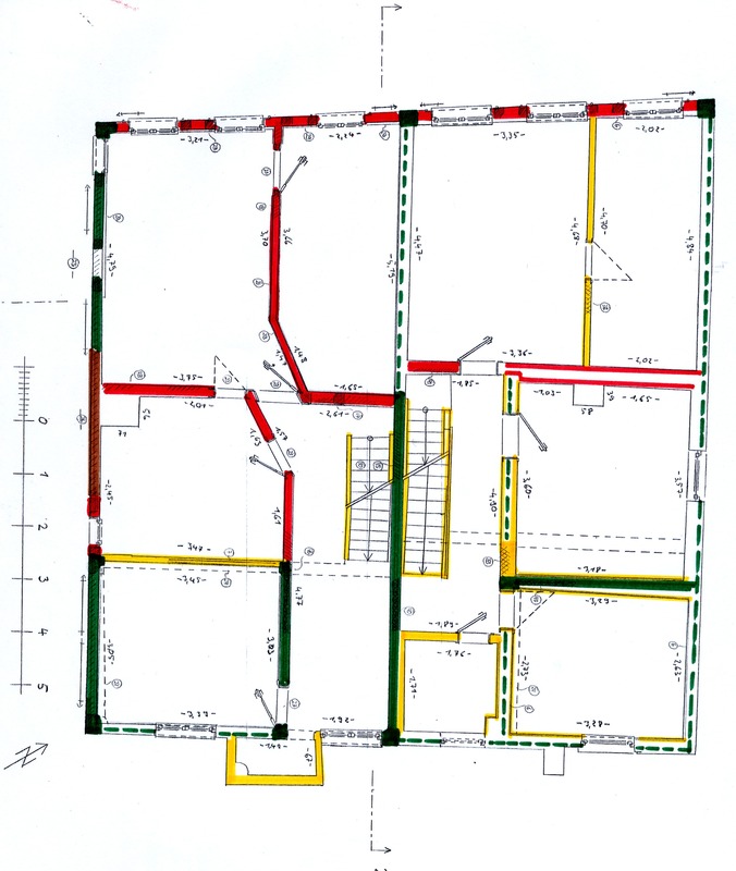 Diese Situation treffen wir auch im zweiten Obergeschoss an, an der sich die ursprüngliche Innenwandsubstanz vollständiger als im Erdgeschoss erhalten hat. Hier ist zu erkennen, dass die Längsflure nicht über die ganze Hauslänge durchliefen, sondern sich nur über die mittlere und südliche Zone des Hausgrundrisses erstreckten, während giebelseitig große Wohnräume angeordnet waren.