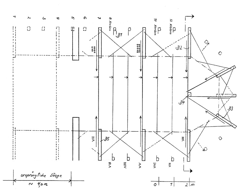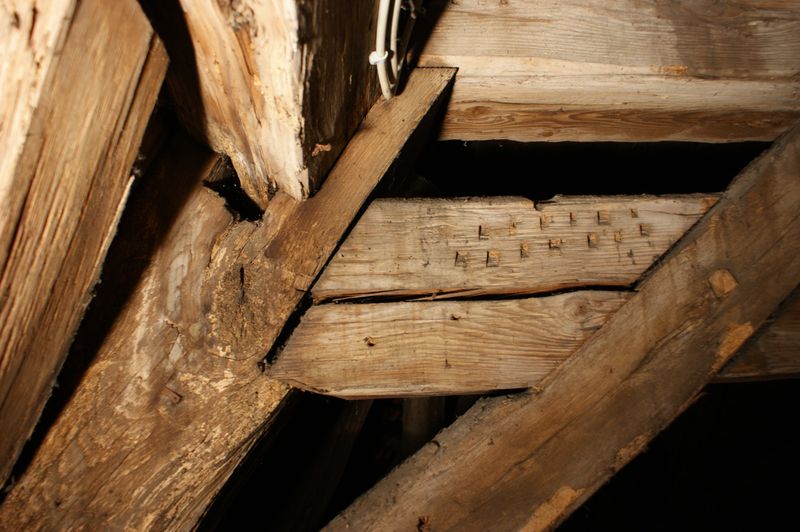 Anders als im Westen, wo die Rähmhölzer die Schnittpunkte mit den Querbinderachsen überqueren, enden im Chorbereich die Rähme an den liegenden Stuhlständern und sind in sie eingezapft.
