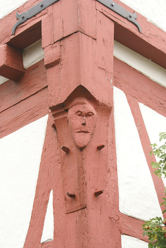 Bauliche Besonderheit: 2 "Neidköpfe", die sich an der nordöstlichen und nordwestlichen Eckkonsole für das übereck vorkragende OG befinden. Bei beiden Köpfen handelt es sich um maskenartige, glatzköpfige Gesichter ohne Bart, von denen das nordöstliche, zähnebleckende Exemplar durch seine hohlen Wangen und die stechenden Augen noch ein wenig schauerlicher daherkommt, als sein vergleichsweise milde, jedoch teilnahmslos blickendendes Pendent.