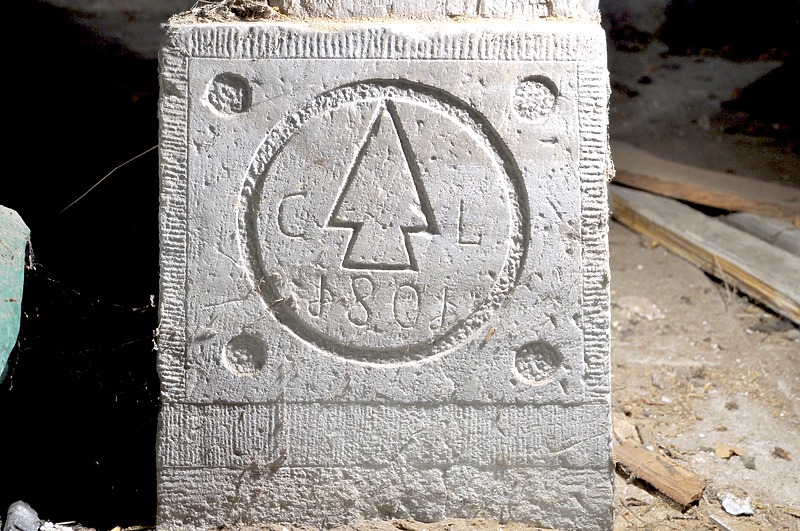Die Jahreszahlen 1801 mit Wappen auf den beiden pyramidenstumpf-förmigen Basen des westlichen Stützenpaars kennzeichnen eine Bauphase. Hierzu gehören die wiederverwendeten profilierten Stützen aus einem anderen, älteren Bauwerk, die auf den Basissteinen stehen. Die Abbundzeichen sind auf den unteren Bereich der Stützen nachträglich eingearbeitet worden. Die beiden Bäume der mittigen Stützen im Erdgeschoss sind Mitte des 17. Jahrhunderts gefällt worden, sodass auch diese von einem anderen Bau zu stammen scheinen. An der östlichen Giebelwand finden sich Eckquaderungen, deren untere Steinlagen steinmetzmäßig mit Randschlag gearbeitet wurden, die oberen weniger handwerklich mit glatten Flächen.