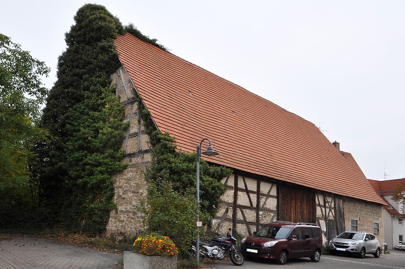 Die Scheune präsentiert sich als eingeschossiger Fachwerk- bzw. Bruchsteinbau mit steilem Satteldach. Die großen, ziegelgedeckten Dachflächen sind nicht durch Gauben oder Öffnungen gestört. Geringe Dachüberstände durch Aufschieblingen liegen an beiden Traufseiten vor.