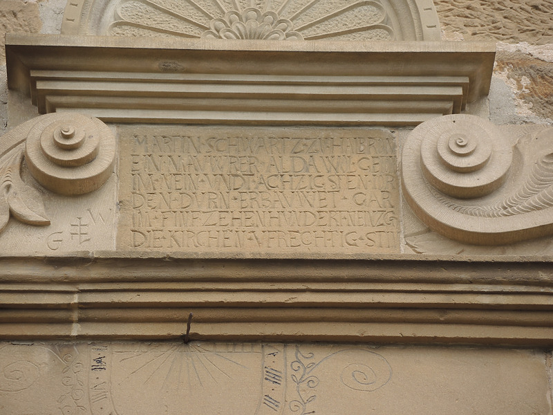 „Martin Schwartz zu Halbron ein Mauwrer alda wol geton im Nein undt achzigsten Ior den Durn erbauwet gar im finfzehenhundert neinzg die Kirchen ufrechtig stin“. Am Portal findet sich zusätzlich die Jahreszahl „1590“.