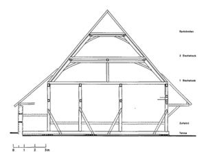 Das Fachwerkgerüst wurde durchgängig als eine Gerüsteinheit abgezimmert. Dabei kragt der Nordgiebel und die ersten 3 Zonen an der westlichen Traufe im OG aus. Die Fachwerkwände sind bzw. waren aus Lehm-Flechtwerk ausgefacht. Die konstruktive Ausbildung des heutigen östlichen Seitenschiffes ist jüngeren Datums, obwohl ursprünglich ein weiteres Seitenschiff angenommen werden kann. Das Dachgerüst ist zweistöckig mit Spitzboden. Es wechseln sich zwei Dachstuhlkonstruktionen ab: Fachwerkwände in Querbundachsen weisen einen dreifach stehenden Stuhl im ersten Dachstock auf, während im offenen Dachraum ein liegender verzapfter Stuhl mit mittiger, unterstützter Pfette vorkommt.