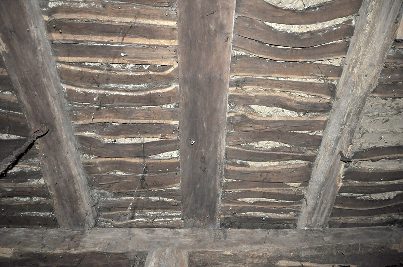 Die Decken des Wohnhauses präsentieren sich als Balkendecken. Sichtbar ist eine davon im Kellerraum -1.01.