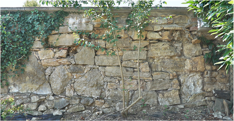 Der Mauerabschnitt östlich von Zäsur und Stufung ist mit deutlich großformatigeren Steinen lagig gemauert.