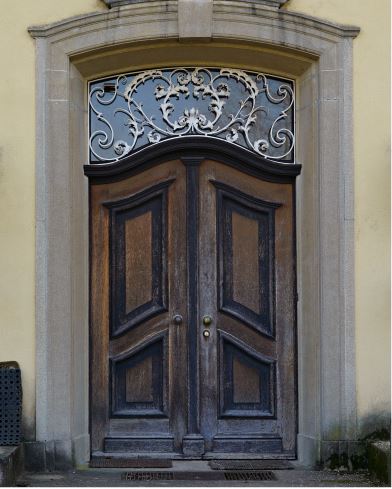 Zweiflügelige Kassettentür des Eingangsportals mit Profilen in Wellenform und Oberlicht mit Ziergitter / Landhaus Umkirch/Fulwell Park in 79224 Umkirch (04.2022 - Dipl. Ing. Stefan King)