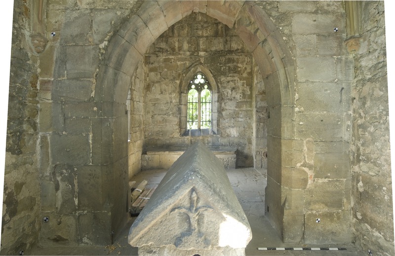 Im gesamten Innenraum sind Reste von Putzen und Farbfassungen erhalten, die auf eine frühere Raumgestaltung mit Putz und steinsichtigen Gewölberippen hindeuten. Auf den Putzresten an der Südwand des Ursprungsbaus befinden sich Tünchereste und Malereifragmente in Form von Weihekreuzen.