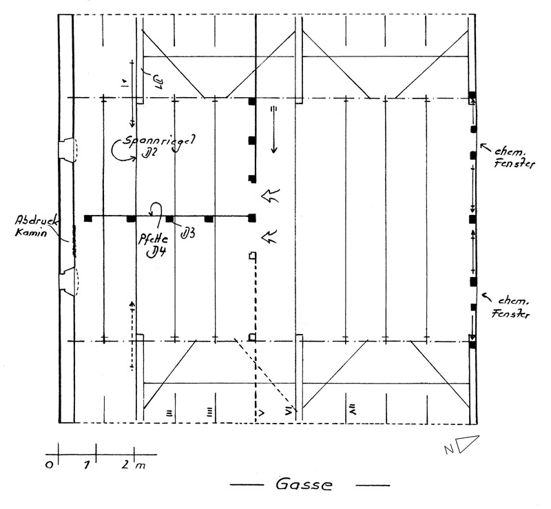 Vor dem Abbruch konnte das in die Jahre 1593/94 (d) datierte Dachwerk untersucht werden, dessen tragendes Gerüst aus einer Kombination von liegenden Querbinderachsen und Fachwerkwänden bestand. Sie begrenzten zwei am talseitigen Hauptgiebel angelegte Dachkammern (s. Abb.). Der rückwärtige Dachgiebel war in Fachwerk abgezimmert und besaß zwei, später durch das Nachbarhaus verdeckte Fensteröffnungen. Ein Befund, der möglicherweise auf eine ehemals freistehende Bebauungssituation des Gebäudes hinweist.