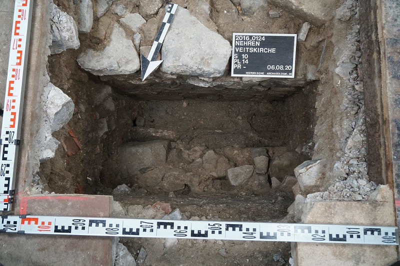 Bauzeitliche Westempore mit Stützen über Punktfundamenten, im Lichten ca. 4,9 m tief. Bauzeitliches Flächenfundament im NO des Langhauses 2 x 1,1 m, auf Fensternische bezogen, dort 1,4 m tief. Einlagig mit großformatigen Werk- u. Bruchsteinen fundamentiert, darüber starker Mörtelaufbau. Der außen verputzte Bereich ragt über den dagegenziehenden Estrich hinaus. Zwei parallele verm. bauzeitliche N-S verlaufende Schwellbalkengruben könnten eine Teilung des Kirchenraums (Lettner?) in einen etwas größeren Westteil (im Lichten 6,2 m) und einen etwas kleineren Ostteil (im Lichten 5,4 m) zu belegen.