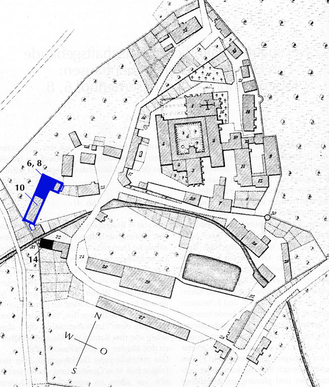 Wie sich gezeigt hat, hat sich auch in der untersuchten Scheune Kasernenhof 6, 8 ein umfangreicher spätmittelalterlicher Baubestand erhalten. Zu einer ersten, dendrochronologisch um 1460 datierten Bauphase gehören die Umfassungsmauern und das Dachgebälk des Nordflügels, der im Erdgeschoß durch eine außermittige Querwand geteilt war und eine längslaufende Tragstruktur in der Mittelachse besaß. Während der östliche Bereich durch eine werksteingerahmte Türöffnung vom Hof her erschlossen war, war der größere westliche Bereich durch eine unmittelbar daneben gelegene, kleine Toröffnung zugänglich. Belichtet wurde er an der Westseite durch zwei werksteingerahmte Rechteckfenster; über die Befensterung an der Nordseite sind wir im Unklaren. Über diesem Unterbau erhob sich ein zumindest an der Westseite vollständig abgewalmtes Satteldach mit einem mittigen stehenden und möglicherweise seitlichen liegenden Stühlen im ersten Dachgeschoß, wovon sich jedoch keine Baureste mehr in situ erhalten haben. Gleichzeitig ist auch die nach Süden ziehende Fortsetzung der Westwand mit einer unregelmäßigen Reihung hochrechteckiger Werksteinfenster ausgestattet, welche belegt, dass hier von Anfang an eine sich bis zur südlichen Klostermauer hin erstreckende Anschlußbebauung vorgesehen war.