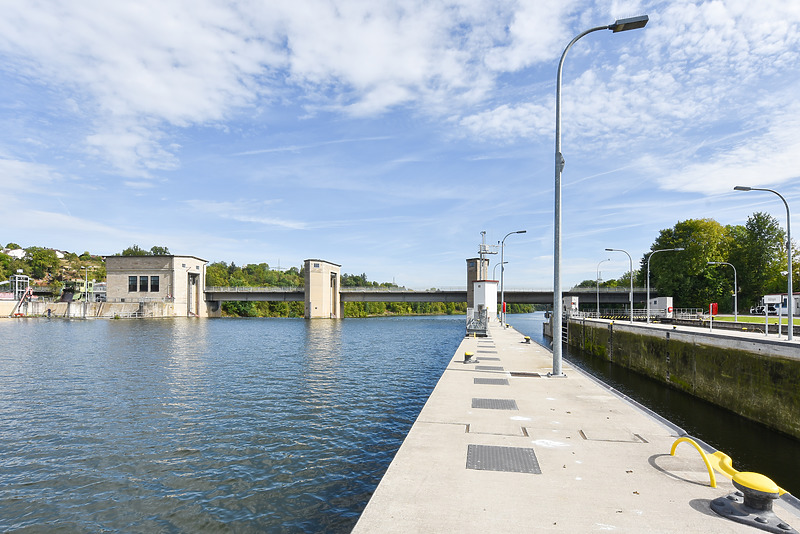 Die Wehrbrücke reicht über die gesamte Kanalbreite (ca. 143m). Auf Höhe des Kraftwerks liegen unterhalb der Brückenfahrbahn Aufenthalts- und Technikräume des Wasserkraftwerks.