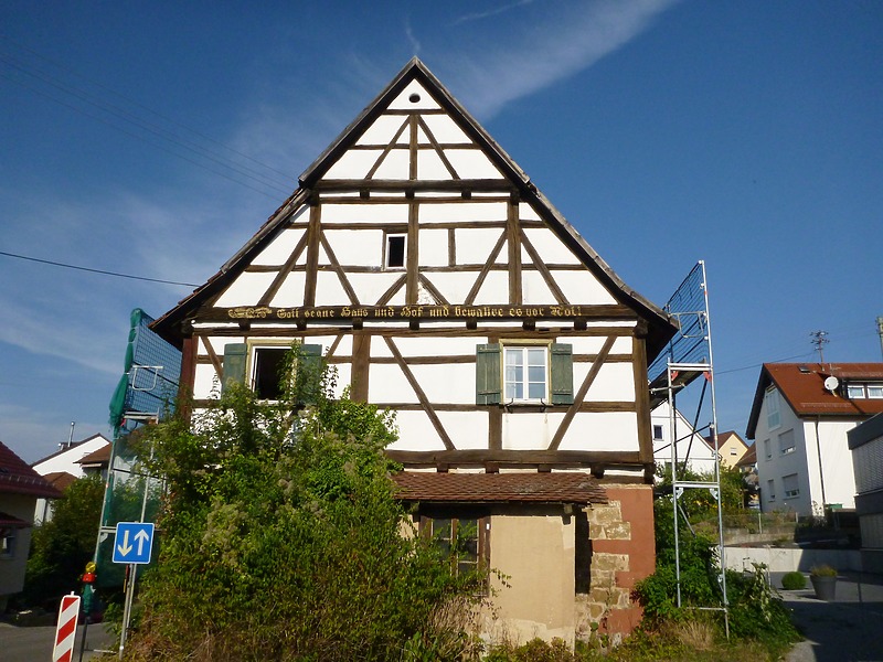 Sichtfachwerkhaus auf Sandsteinmauerwerk. Errichtung des Gebäudes um 1507/08 (d)