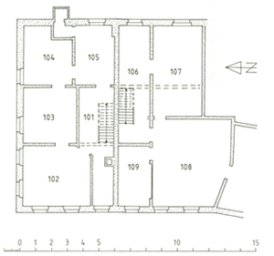 Beide Gebäudeteile haben einen separaten Eingang. Im Erdgeschoss waren entlang des mittig liegenden Flurs die Stallräume angegliedert. Im südlichen Teil ist jetzt ein Laden angeordnet. Im Obergeschoss gliedern sich die Räume um das mittige Treppenhaus. Die Küchen sind in beiden Gebäudeteilen im östlichen Bereich angegliedert. Das Dachgeschoss wurde erst später als Wohngeschoss ausgebaut. Der Grundriss ist entsprechend dem 1. Obergeschoss strukturiert. In den Querwänden kann die Lage der Stuhlrähme abgelesen werden.