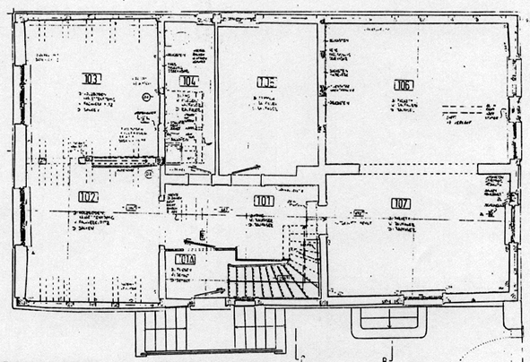 Das Gebäude wird mittig, von Süden her, über eine Treppe erschlossen.