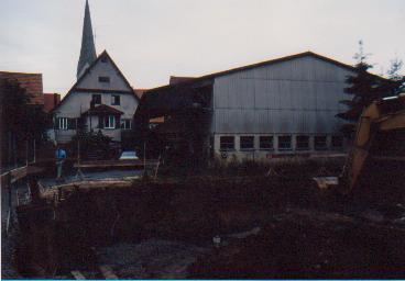 Die 1995 ausgeschachtete Baugrube liegt im Bereich des ehemaligen Burghügels vor der Stadtmauer von Grötzingen. Die Aich war ehemals auch durch den Stadtgraben geführt, so dass sich die Burg in einer geschützten Insellage befand. Dies kann noch auf der Abbildung im Kieserschen Forstlagerbuch um 1685 nachvollzogen werden, obwohl die Burg zu diesem Zeitpunkt bereits abgegangen war. Die Katasterpläne des 19. Jh. zeigen den nun nicht mehr durchflossenen Bacharm noch als Auezone. In der Baugrube konnte nun unter 2,5m starken Aufplanierungen die Schlammzone der Auezone der Aich festgestellt werden. In das schwarzbraune Material waren entsprechende Siedlungsreste als Abfall eingelagert, die nach der Fundkeramik in das 14. Jahrhundert datieren. Ca. 3m unter der heutigen Oberfläche konnten verschiedene, gut erhaltene Hölzer beobachtet werden. Darunter ein ca. 6m langer Balken mit verschiedenen Blattsitzen und Zapfenlöchern. Nach Auskunft der Bauleute lag der Balken auf einem ca. 1,5m langen, wenig in Form gebrachtem Schwellholz, dieses wiederum auf einem senkrecht eingerammten Pfahl. Alle drei Hölzer wurden von der Baufirma geborgen. In den Schachtungen für Punktfundamente konnten weitere offenbar bearbeitete Hölzer beobachtet werden. Diese wurden im Boden belassen. Es muss offen bleiben, ob hier Auflager für Bauteile einer ehemaligen Burg angeschnitten sind. Daneben fanden sich verschiedene Holznägel, die möglicherweise im Zuge des Abbruchs einer entsprechenden Konstruktion in den Boden gelangten. Der geborgene Balken wurde dendrochronologisch untersucht und datiert um 1272. Der Balken dürfte aller Wahrscheinlichkeit nach als Schwellbalken zum Stützblock einer ehemaligen Brücke gehört haben.